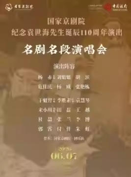 国家京剧院纪念袁世海先生诞辰110周年演出《名剧名段演唱会》时间:2026.06.07 周日 19:30场馆:北京市 | 梅兰芳大剧院-大剧场 票价:100/180/280/380/480/580/680/880微信订票:18515362586电话订票:010-66552100,010-66552258