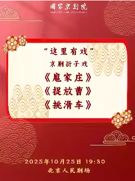 国家京剧院“这里有戏”京剧折子戏《扈家庄》《捉放曹》《挑滑车》 时间:2025.10.25 周六 19:30 场馆:北京市 | 北京人民剧场 票价:100/180/280 微信订票:18515362586 电话订票:010-66552100,010-66552258