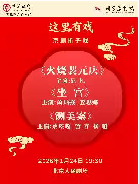 国家京剧院“这里有戏”京剧折子戏《火烧裴元庆》《坐宫》《铡美案》 时间:2026.01.24 周六 19:30 场馆:北京市 | 北京人民剧场 票价:100/180/280 微信订票:18515362586 电话订票:010-66552100,010-66552258