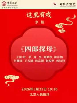 国家京剧院“这里有戏”京剧《四郎探母》 时间:2026.03.22 周日 19:30 场馆:北京市 | 北京人民剧场 票价:100/180/280 电话订票:010-66552100,010-66552258 微信订票:18515362586